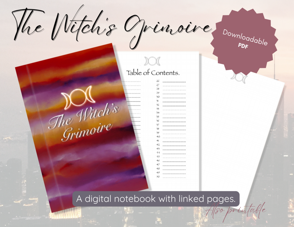 Keep notes in this easy to use Witch's Grimoire Notebook. The content page has linked numbers to each page. Easily add more pages by copying and pasting the page, but the original page will be the linked page back to the table of contents.